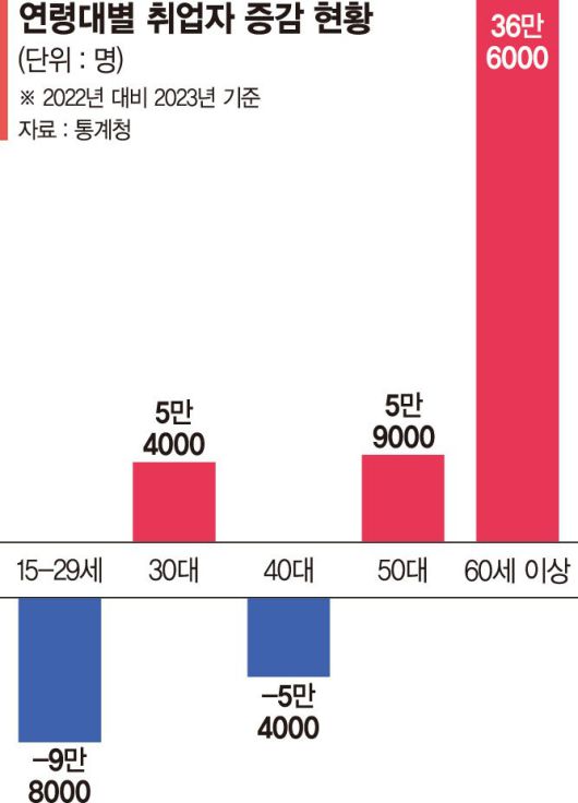 통계청에 따르면 2023년 40~49세 취업자는 626만명이다. 전년 대비 5만4000명 감소했다. 반면 60세 이상 취업자는 622만4000명이다. 같은 기간 36만6000명 증가했다. 40대 취업자는 감소하고 60대 이상은 증가하는 추세는 올해도 이어질 것이 확실시 된다. 만약 올해 이같은 흐름이 확정되면 1963년 관련 통계 작성이 시작된 이후 61년만에 처음 있는 일이 된다.