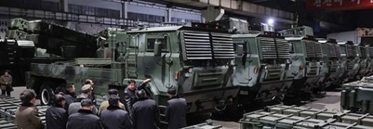 김정은 북한 국무위원장이 지난 8~9일 단거리탄도미사일 용 이동식발사대 를 생산하는 군수공장을 현지 지도하고 있다. [연합뉴스] |