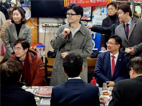 한 위원장은 이날 저녁 흰색 맨투맨 셔츠에 회색 코트 등 격식 없는 차림으로 자갈치시장을 방문, 조경태·서병수 등 국민의힘 부산 지역구 의원들과 만찬을 했다. 회와 매운탕 등 해산물이 메뉴로 나왔다.