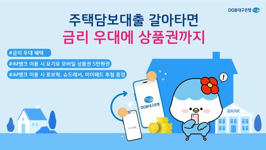 [헤럴드경제=문혜현 기자] DGB대구은행은 주택담보대출 대출이동서비스를 실시하고, 금리우대 적용 및 모바일 앱 iM뱅크 이벤트를 진행한다고 11일 밝혔다.