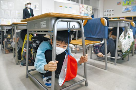 지난해 11월 일본 센다이시의 한 초등학교에서 학생들이 지진 발생 시 책상 밑으로 들어가 몸을 보호하는 훈련을 하고 있다. 아사히신문 제공 |
