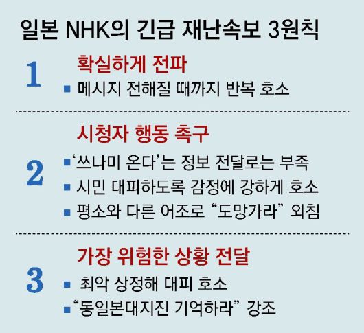 일본에서도 화제가 된 이날 방송은 즉흥적인 대응이 아니다. 철저히 ‘NHK 재난방송 매뉴얼’을 따랐다. NHK는 2011년 동일본대지진 당시 침착한 재난방송이 오히려 시청자에게 대피 필요성을 충분히 전달하지 못했다는 반성 아래 대대적으로 매뉴얼을 개편했다. 이때 재난방송 3원칙인 ‘확실하게 전파’ ‘시청자 행동을 촉구’ ‘가장 위험한 상황을 전달한다’가 세워졌다.