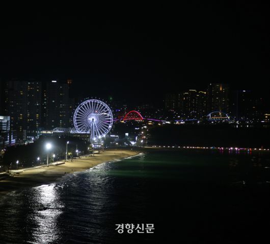 롯데리조트속초에서 바라본 속초 야경. 관람차 ‘속초 아이’ 불빛이 밤바다를 밝히고 있다. 이윤정 기자 |
