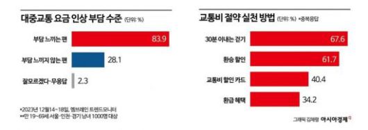 국민 상당수는 현재도 교통비 부담을 체감하고 있다. 시장조사 전문기업 엠브레인 트렌드모니터가 지난달 14~18일 만 19~69세 서울·인천·경기 거주 남녀 1000명을 대상으로 조사한 결과에 따르면, 응답자의 83.9%가 ‘교통비 부담을 느끼는 편’이라고 답했다. 특히 20대(80.5%)와 서울~인천, 서울~경기 통근·통학자(76.5%)들이 교통비 부담을 많이 느끼는 것으로 분석됐다. 1회로 따지면 몇백 원에 불과하지만, 한 달로 치면 경제적 부담이 크다는 얘기다.