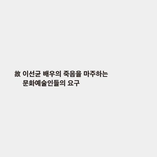 앞서 봉준호·장항준 감독, 가수 윤종신, 배우 최덕문·김의성 등이 함께 한 문화예술인 연대회의는 지난 12일 '고 이선균 배우의 죽음을 마주하는 문화예술인들의 요구' 성명서를 발표했다. 이선균 사망과 관련 ▲수사 당국 ▲언론 ▲정부와 국회를 향한 요구가 담겼다.