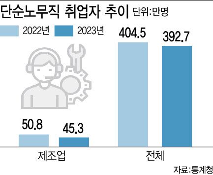 통계청 관계자는 “단순노무직은 사회시설관리업, 건설업 등에서도 줄었지만 제조업에서 가장 많이 줄었다”라며 “제조업 부진이 단순노무직 감소에 주된 영향을 준 것”이라고 설명했다.