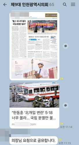 15일 인천시의회에 따르면 허 의장은 이날 오전 11시께 시의회 간부에게 '5·18은 북한이 개입한 국가전복 변란이었다'는 주장이 담긴 신문 기사 사진과 링크를 카카오톡으로 보내면서 시의원 단체카톡방에 공유하도록 지시했다.