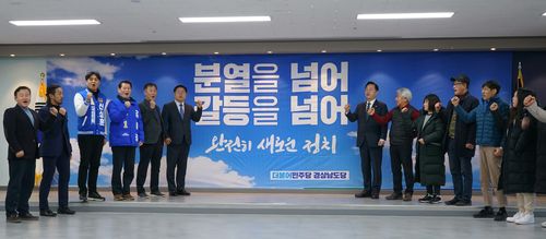 (창원=연합뉴스) 김선경 기자 = 더불어민주당 경남도당이 오는 4월 총선 슬로건을 '분열을 넘어, 갈등을 넘어, 완전히 새로운 정치'로 확정했다.