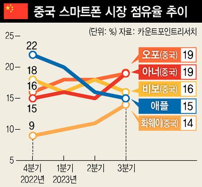 애플의 중국 시장 점유율은 빨간불이 켜진 상태다. 시장조사업체 카운터포인트리서치 조사 결과, 중국에서 아이폰15가 출시된 지난해 9월 22일부터 17일 동안 판매량은 전작보다 4.5% 감소한 것으로 나타났다. 중국정보통신연구원 조사 결과에서도 새 아이폰을 출시한 애플의 지난해 4분기 시장 점유율은 20%로 15% 안팎 점유율을 달성한 중국 화웨이와 아너, 오포와 격차를 벌리지 못했다. 중국 시장은 애플 매출 가운데 20%(2023년 상반기 기준)에 이른다.