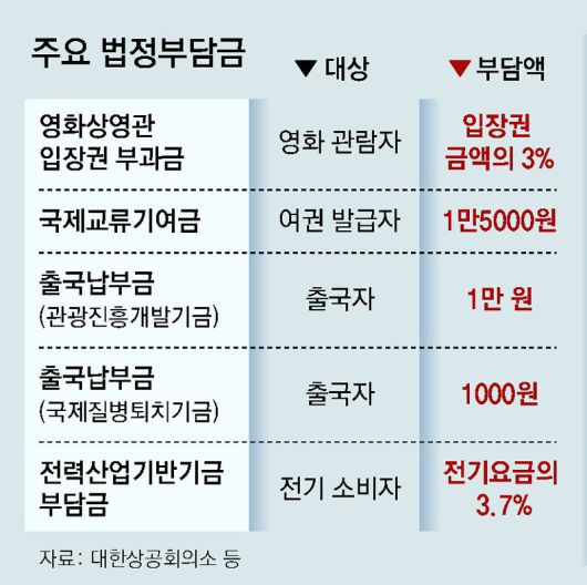여권을 발급할 때 1만5000원(10년 유효 복수여권 기준)씩 부과되는 국제교류기여금, 출국자에게 1만1000원이 부과되는 출국납부금 역시 비슷한 논란이 이어져 왔다. 대한상공회의소는 지난해 8월 ‘법정부담금 제도의 문제점 및 개선방안 연구’를 통해 이들 3개 부담금은 물론 전력산업기반기금 부담금, 국민건강증진 부담금, 지하수이용 부담금 등의 개선이 필요하다고 밝힌 바 있다. 기재부 관계자는 “예정된 부담금 점검, 평가를 신속히 추진해 올해 안에 개편 계획을 내놓을 예정”이라고 말했다.