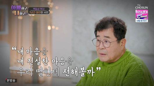 백일섭은 “7년 만에 봤을 때는 손주들이랑 같이 있었고, 간단한 말을 했다. 늘 그랬듯 겉도는 대화만 오갔다. 직접 대화하는 게 없어서 (딸의 마음이 어떤지) 방향을 모른다. 장막이 껴있으니까. 나는 사랑하는 마음을 항상 갖고 있다. 세상 하나뿐인데”라고 전했다.