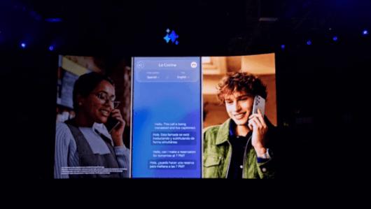 삼성전자는 무대에서 갤럭시S24 울트라로 영어 사용자가 스페인어를 쓰는 사람과 문자 메시지를 바로 주고 받는 장면을 보여줬다.