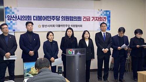 기자회견하는 양산시의회 민주당 소속 의원들 |