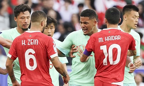 17일(현지시각) 카타르 도하 알투마마 스타디움에서 열린 아시아축구연맹(AFC) 2023 카타르 아시안컵 A조 조별예선 2차전 레바논과 중국의 경기, 후반 양팀 선수들이 충돌하고 있다. 뉴시스 |