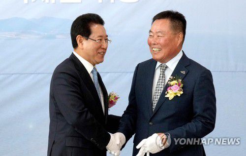 무안국제공항서 만난 김영록 전남지사-김산 무안군수 |
