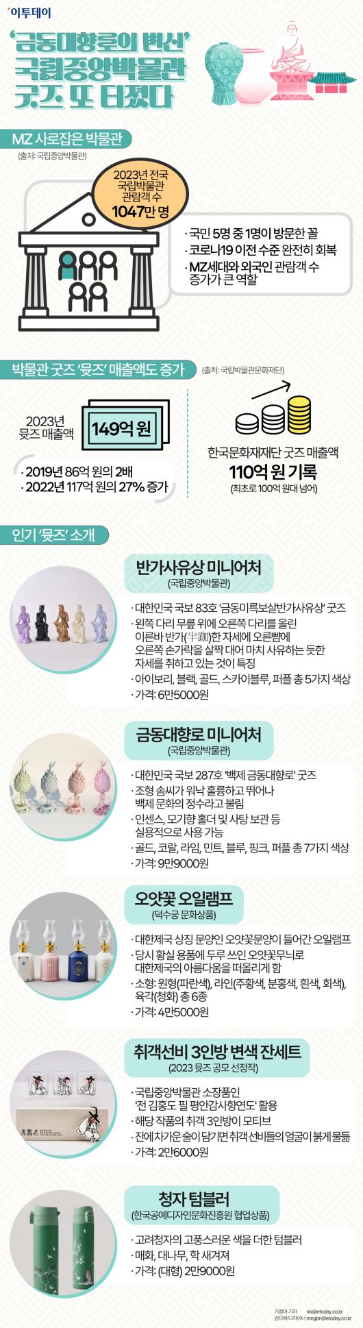 일명 ‘뮷즈’로 불리는 이 상품들 덕에 박물관 굿즈 매출액은 지난해 149억 원을 기록했는데요. 코로나 팬데믹 이전과 비교하면 2배가 늘어난 수치입니다.