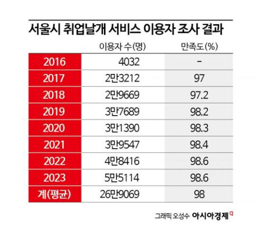 서비스를 이용한 청년 구직자들의 만족도는 높은 편이다. 서울시가 정장 대여 서비스 이용자를 대상으로 조사한 결과 평균 만족도는 98%에 달했다. 지난해에는 98.6%의 이용자가 만족한다고 답했다. 이용자 역시 늘어나는 추세다. 취업날개 서비스 도입 첫해인 2016년 4032명이었던 이용자 수는 지난해 5만5114명으로 13.7배 증가했다. 누적 이용 건수는 26만9069건이다.