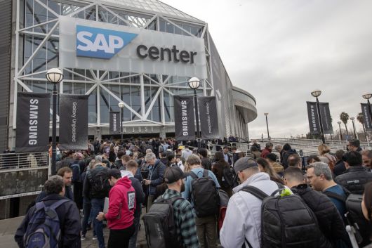 17일(현지시간) 미국 캘리포니아주 새너제이에 위치한 SAP 센터에서 개최된 삼성전자 '갤럭시 언팩 2024'에 입장하기 위해 관람객들이 길게 줄을 서 있다. 삼성전자 제공 |