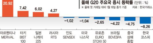 인베스팅닷컴에 따르면 세계 주요 증시 가운데 최근 한 달 동안 코스피지수(-5.11%)보다 많이 빠진 곳은 폴란드 WIG20지수(-7.94%), 홍콩항셍지수(-6.86%), 중국 선전종합지수(-6.02%) 등이다.