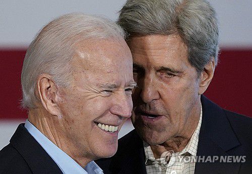 조 바이든 대통령(좌측)과 대화하는 존 케리 기후특사(우측) |