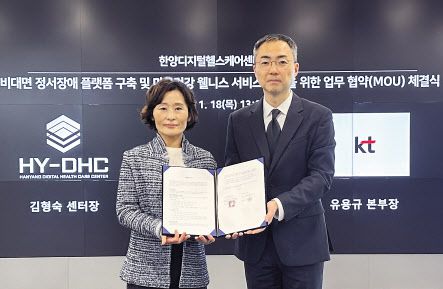 KT는 18일 한양대 디지털헬스케어센터와 비대면 정신건강 플랫폼 구축 및 웰니스 서비스 협력을 위한 업무협약(MOU)을 체결했다. 업무협약식에 참석한 유용규(오른쪽) KT 전략신사업기획본부장(상무)과 김형숙 한양대 디지털헬스케어센터장(심리뇌과학과 교수). [KT 제공] |