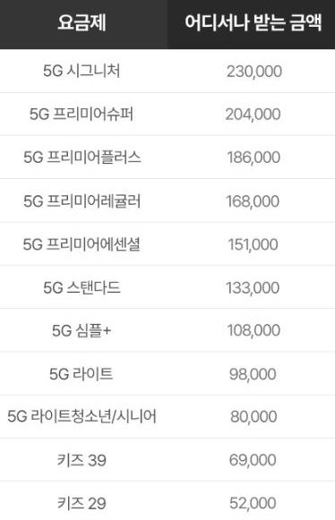 LG유플러스는 월 13만원 요금제인 '5G 시그니처' 기준 23만원의 공시지원금을 책정했고, 최저 요금제 '5G 키즈 29(월 2만9000원)'를 적용할 경우 5만2000원의 공시지원금을 지원한다.