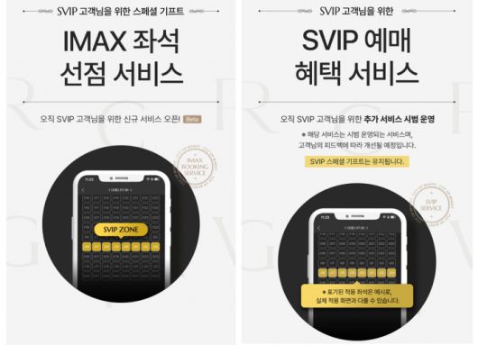 SVIP 고객은 관련 서비스 시행 결정에 따라 아이맥스관에서 개봉하는 영화의 상영 스케줄이 열릴 경우 극장별 적용 좌석을 60분간 먼저 선점할 수 있는 혜택이 주어진다. 단 이들 고객을 제외한 전체 회원은 예매 오픈과 동시에 1시간 동안 SVIP 적용 좌석을 예매할 수 없다.
