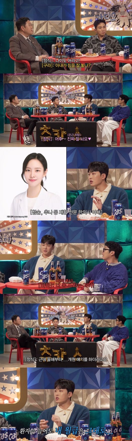 그러자 김구라는 아내가 침을 잘 놓냐고 질문, 조정식은 "진짜 잘 놓는다. 재활 전문인데 침, 추나 너무 잘한다"고 말해 애정을 한껏 드러냈다.
