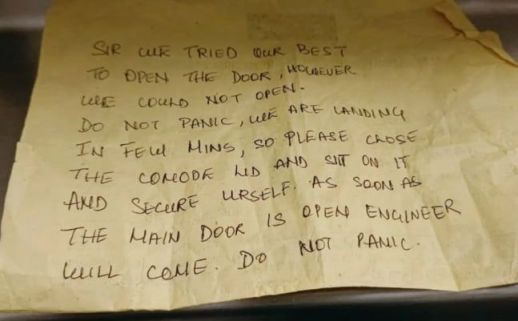 이 쪽지에는 "문을 열려고 최선을 다했지만 열 수 없었습니다. 당황하지 마십시오. 몇 분 후에 착륙할 예정이므로 변기 뚜껑을 닫고 그 위에 앉아 몸을 안전하게 보호하세요. 항공기 문이 열리자마자 엔지니어가 올 것입니다. 당황하지 마세요"라고 적혀 있었다.