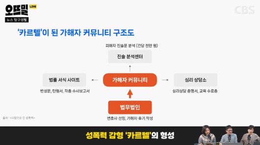 ◆ 조석영> 그걸 법무법인에서 만들어주는 거죠. 역시 CBS 민소운 기자가 취재한 내용인데요. 법무법인 쪽에서 "(가해자가) 명문대생이면 학창시절 생활기록부가 좋았을 거니까 이것도 감형 자료로 제출해라" 얘기를 하는 거죠. 그리고 성범죄 가해자들이 정보를 공유하는 온라인 커뮤니티가 있는데, 거기에 본인이 기소유예, 그러니까 사실상 무죄를 받은 후기가 올라와있어요. 성적 우수상, 대학 성적표, 군대 표창장, 봉사 및 기부 내역은 물론이고 심지어는 가족사진, 인생 일대기 및 인생 계획서를 자료로 제출해서 기소유예를 받았다고 합니다. 가해자 변호사들이 이 모든 걸 싹싹 긁어서 감형 자료를 만드는 거죠. 그리고 가져오라는 수준을 넘어 기획을 해줄 수도 있는데 여기에 카르텔이 개입돼 있다는 지적도 있습니다.