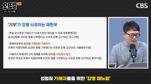 ◆ 조석영> 저도 그 논란을 보고 이 주제를 정리해봐야겠다는 생각이 들었는데요. 당연히 가해자로 지목된 사람들도 변호 받을 권리가 있습니다. 다만 법에 정해진 형량에 한참 못 미치는 처벌이 나오거나 징역이 아닌 집행유예가 나오는 감형이 너무 많다는 거죠. 오죽하면 성범죄자들이 돈을 써서 감형을 구매하는 매뉴얼이 있다는 얘기까지 나옵니다.