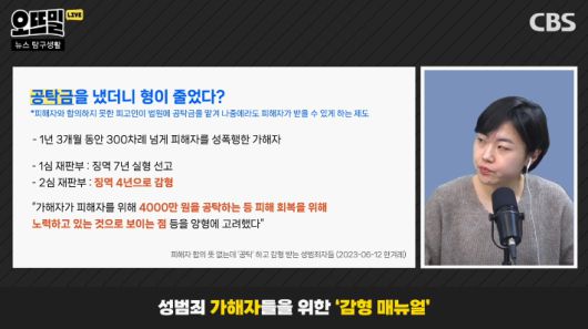 ◆ 조석영> 이건 성범죄에만 쓰이는 제도는 아닌데요. 피해자도 모르는 합의금 같은 게 들어오는 거예요. 2016년에 취업 사기를 쳐놓고 피해자에게 '너도 일부 가담했잖아' 협박해서 1년 3개월 동안 무려 300차례 넘게 피해자를 성폭행한 가해자가 있었습니다. 2019년에 1심에서 징역 7년이 나왔는데 항소심에서 징역 4년으로 감형을 해줘요. 감형 사유에 "가해자가 피해자를 위해 4천만 원을 공탁하는 등 피해 회복을 위해 노력하고 있는 것으로 보이는 점"이 들어가 있다고 합니다.