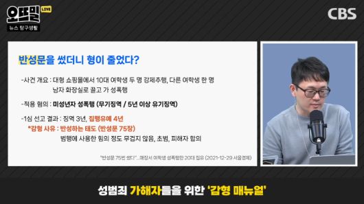 ◆ 조석영> 크게 두 가지로 나눌 수 있는데, 하나는 가해자가 반성하고 있다는 걸 보여주는 방식이고, 다른 하나는 감형 스펙을 만드는 겁니다. 먼저 반성에서 가장 대표적인 건 반성문이죠. 2021년 한 쇼핑몰에서 10대 여학생 2명을 뒤따라가서 추행하고, 그 뒤에는 다른 10대 여학생을 다짜고짜 남자 화장실로 끌고 가서 성폭행한 20대 남성이 있었습니다. 미성년자 성폭행이죠. 아청법 제7조 1항에 따르면 무기징역, 또는 5년 이상 유기징역이 나와야 하는데, 선고 결과 징역 3년에 집행유예 4년이 나왔습니다. 가해자가 75장이나 반성문을 썼다고 하네요.