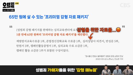 ◆ 조석영> 그렇죠. 그런데 가해자가 알아서 반성문을 쓴 것일 수도 있지만 가해자 전문 법무법인에서 이런 감형자료 세트를 가해자들에게 소개해준다는 거예요. CBS 민소운 기자가 작년에 취재한 내용인데요. 성범죄 전문 로펌에 가봤더니 반성문, 탄원서 같은 감형 자료 세트를 주면서 이런 서류를 "예쁘게 갖다주면 된다"고 했다는 겁니다. 가해자가 반성하는지 여부는 묻지도 않고 이 서류 잘 꾸며오라고 하는 거죠.