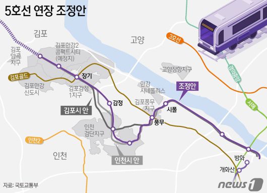 한편 국토교통부 대도시권광역교통위원회(대광위)는 19일 서울 5호선 김포검단 연장사업의 조속한 추진을 위해 노선 조정과 사업 비용 분담 방안 등의 조정방안을 제시했다.