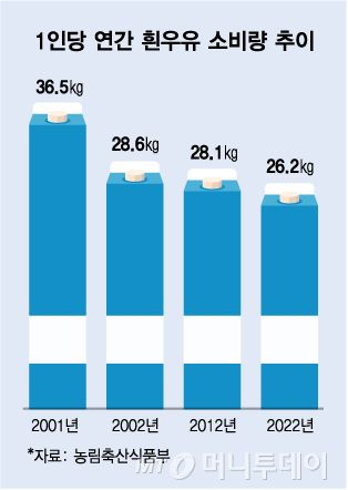 A2 우유의 인기는 저출산 여파로 국내 우유 시장이 축소하는 것과 반대되는 흐름이다. 시장조사회사 유로모니터에 따르면 우유 시장 규모는 지난해 2조6200억원으로 추정된다. 2020년 대비 1.15% 증가에 그쳤다. 1인당 연간 흰 우유 소비량은 2002년 28.6kg에서 2022년엔 26.2kg으로 줄었다.