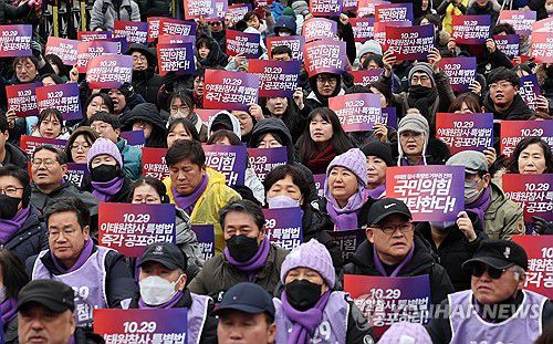 이날 집회에는 더불어민주당 박찬대 최고위원과 정의당 김준우 비상대책위원장, 진보당 윤희숙 상임대표 등 야당 인사들도 참가했다.