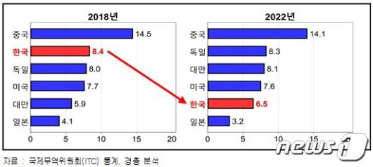 같은 기간 중국과 미국의 점유율은 소폭 줄었고 대만과 독일은 오히려 상승하면서 우리나라의 점유율은 세 단계 하락해 △중국(14.1%) △독일(8.3%) △대만(8.1%) △미국(7.6%) 다음으로 밀려났다.