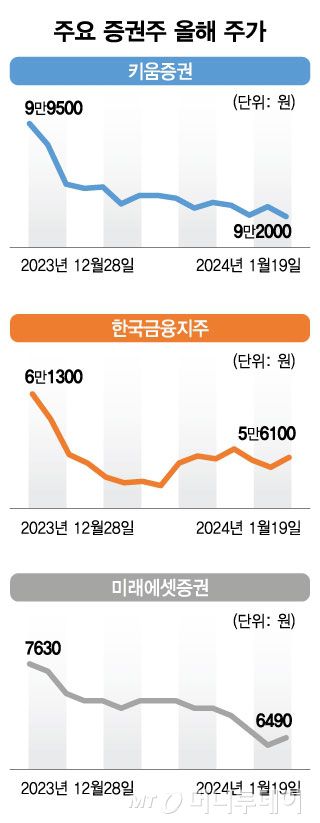 안영준 연구원은 "대부분 일회성 비용이어서 추후 대규모 비용 발생 가능성이 제한적이고 2024년부터는 경상 이익도 회복될 것"이라며 "올해 금리 하락과 더불어 자본시장 선진화 방안으로 개인투자자 증시 유입도 증가할 것"이라고 내다봤다. 이에 따라 증시 거래대금 증가 수혜가 크고, 부동산 익스포저는 낮은 키움증권과, 일회성 비용 반영에도 양호한 수익성을 시현했지만 주가 낙폭이 큰 한국금융지주를 눈여겨보라고 조언했다.