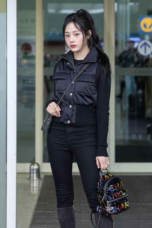 이날 민지는 2023/24 코코 네쥬 컬렉션 베스트에 스웨이드 롱 부츠로 올블랙 코디를 선보였다. 여기에 2023/24 크루즈 컬렉션의 미니 백팩, 2024 봄-여름 레디-투-웨어 프리 컬렉션의 미니 체인백을 착용해 센스 있는 백 레이어링과 이터널 N°5 싱글 이어링으로 포인트를 주며 세련된 공항패션을 완성했다.