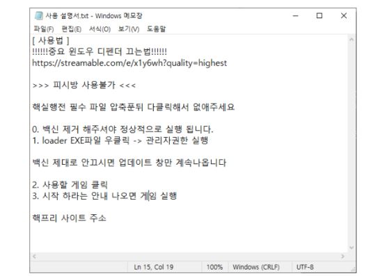 게임핵 파일 사용 설명서에 윈도우디펜더 등 백신 프로그램을 제거하라는 요구가 적혀 있다. /사진=ASEC 홈페이지 캡쳐 |