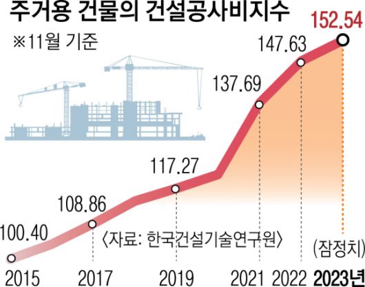 공사비 급등으로 삐걱거리는 재건축·재개발 사업장도 늘고 있다. 한국건설기술연구원에 따르면 지난해 11월 기준 주거용 건물의 건설공사비지수는 152.54(잠정치)로, 2022년 11월(147.63)보다 3.32%, 2021년 11월(137.69)과 2020년 11월(120.59)보다 각각 10.78%, 26.49% 올랐다.