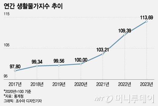 22일 통계청 국가통계포털(KOSIS)에 따르면 지난해 연간 생활물가지수는 113.69(2020년=100)으로 전년 대비 3.9% 상승했다. 국제통화기금(IMF) 외환위기 이후 최고치를 기록한 2022년(6%)보단 낮지만 여전히 4%대에 육박하는 높은 수준이다.