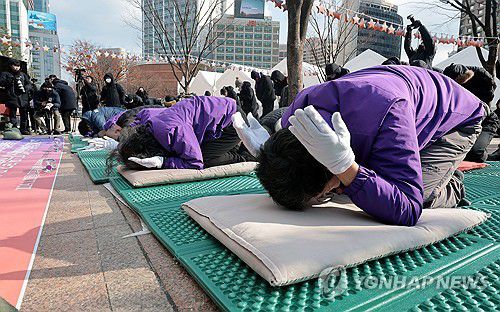 한파가 절정에 달한 이날, 유족과 시민 약 30명은 오후 2시 15분께 분향소 바로 앞에 얇은 등산용 매트와 방석을 깔고 얇은 외투, 장갑 등만 걸친 채 영정을 향해 절을 하기 시작했다.