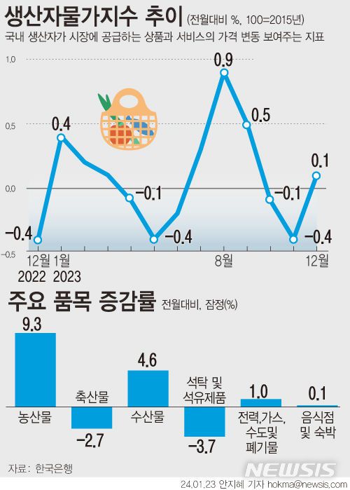 23일 한국은행이 발표한 지난해 12월 생산자물가지수는 121.19(2015년 100기준)으로 전월 대비 0.1% 올랐다. 유가 내림세에 석유제품, 화학제품 등이 내렸지만, 농산물과 산업용 도시가스 등이 오른 이유가 크다.