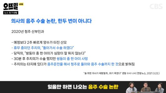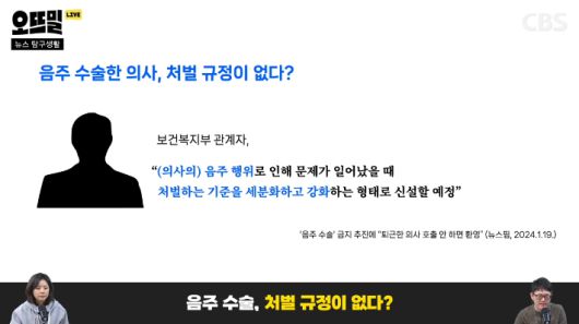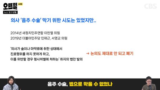 ◇ 채선아> 음주운전은 당연히 처벌 되고, 온라인 음주 방송도 하지 말라는 가이드라인도 나온 상황이잖아요. 그런데 생명을 다루는 의료 현장에서 음주 수술이 처벌이 안된다구요?