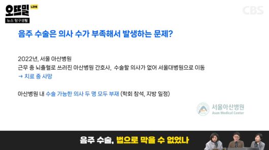 ◆ 조석영> 대놓고 술을 마시고 수술해도 된다는 얘기를 하는 건 아닌데 결과적으로 같은 얘기가 되는 거죠. 그런데 의사협회의 이 얘기를 들어보면 생각해볼 만한 점이 있어요. 우리나라에 필수 의료인력 부족하다는 얘기가 계속 나왔잖아요. 큰 병원도 예외는 아닙니다. 2022년 우리나라 빅5 병원 중 하나인 서울아산병원에서 30대 간호사가 근무 중에 뇌출혈로 쓰러져서 응급실로 이동을 했는데 개두 수술이 필요한 상황이었어요. 아산병원에 이 수술이 가능한 신경외과 교수가 2명이 있었는데 각각 학회 참석과 지방 일정으로 부재중이었어요. 그래서 환자인 간호사가 서울대병원으로 이동했지만 치료 중에 사망했죠.