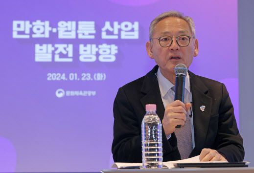 유인촌 문화체육관광부 장관은 23일 서울 종로구 아트코리아랩에서 이같은 내용이 담긴 ‘만화·웹툰 산업 발전 방향’을 발표했다. 유 장관은 “이번 전략과 추진과제들을 속도감 있게 추진해 현장에서 변화를 체감할 수 있도록 문체부가 가용할 수 있는 자원을 모두 동원하겠다”고 밝혔다.