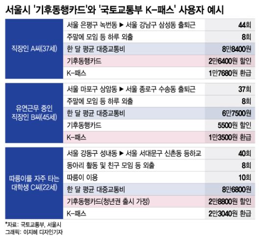 반면 대중교통 이용이 상대적으로 적거나 다른 지역으로 이동이 잦은 이들의 경우 'K-패스'가 유리할 수 있다. 예를 들어 마포구 상암동에서 종로구 수송동으로 출퇴근하지만, 재택근무를 병행 중인 B씨는 'K-패스'를 이용할 경우 더 많은 혜택을 받는다. 대중교통 이용을 월 45회 정도로 잡고, 거리비례 교통요금이 1500원으로 가정하면 B씨는 'K-패스'를 사용하면 '기후동행카드'를 구입했을 때보다 8000원 정도를 절약할 수 있다.