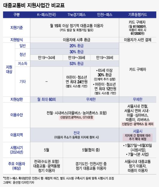 국토교통부의 'K-패스', 경기도의 'The 경기패스' 등 대중교통비 지원 정책이 쏟아지는 가운데, 서울시가 첫 주자로 23일부터 '기후동행카드' 판매에 들어갔다. 첫 타자로 나서 기대감이 크지만 전 국민이 대상인 'K-패스'와 헷갈린다거나, 비슷한 정책이 아니냐는 지적도 있다. 선택지가 다양해진 만큼 무엇이 유리할지 살펴볼 필요가 있다.
